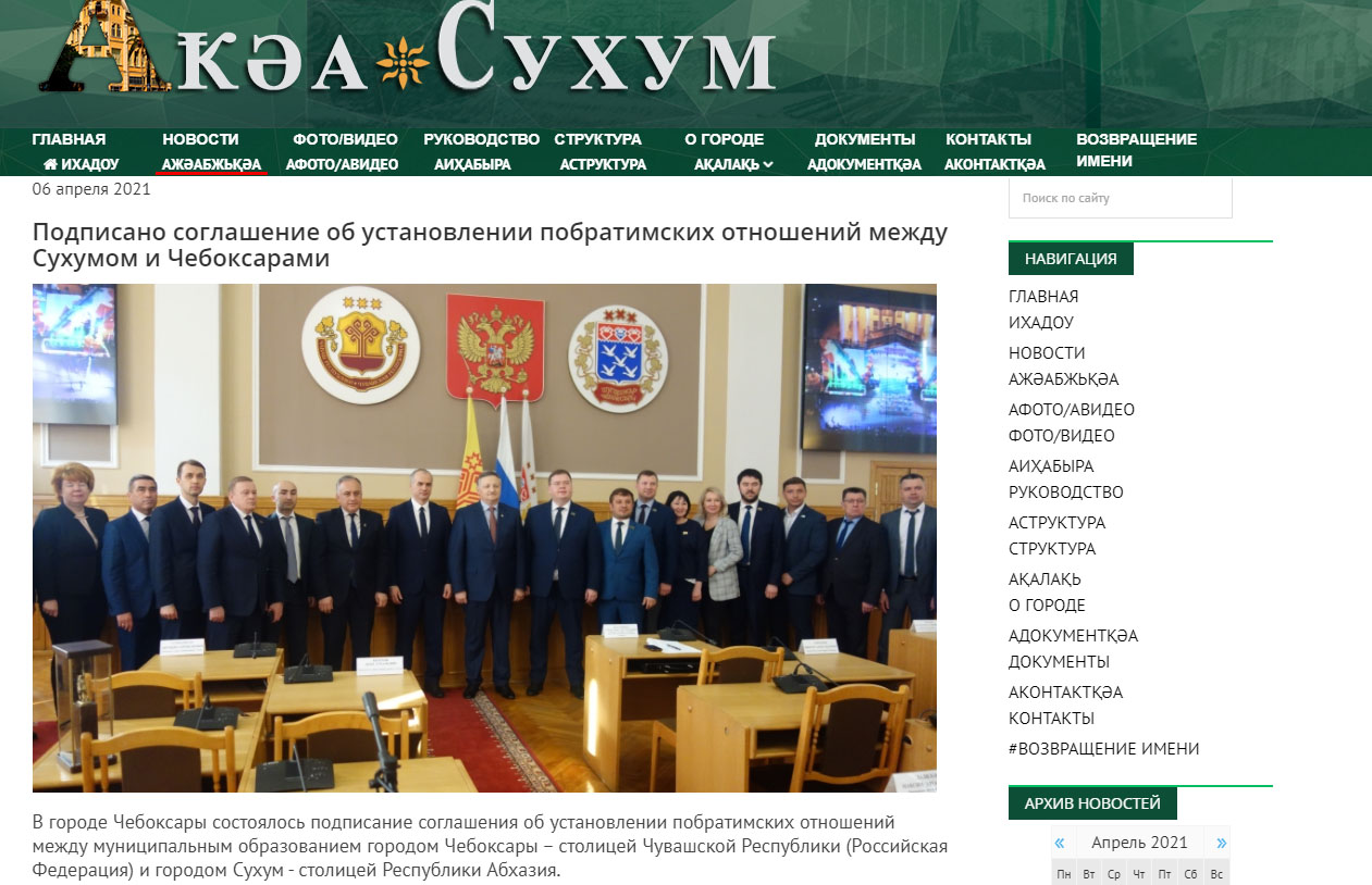 На сайте администрации Сухуми появилась новость о том, что в Чувашии прошло подписание соглашение о установлении побратимских отношений с Чебоксарами.